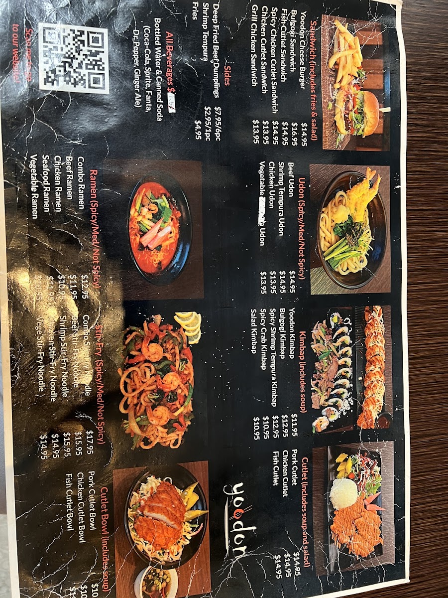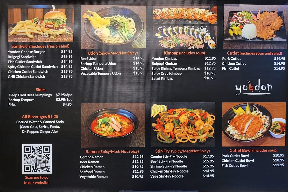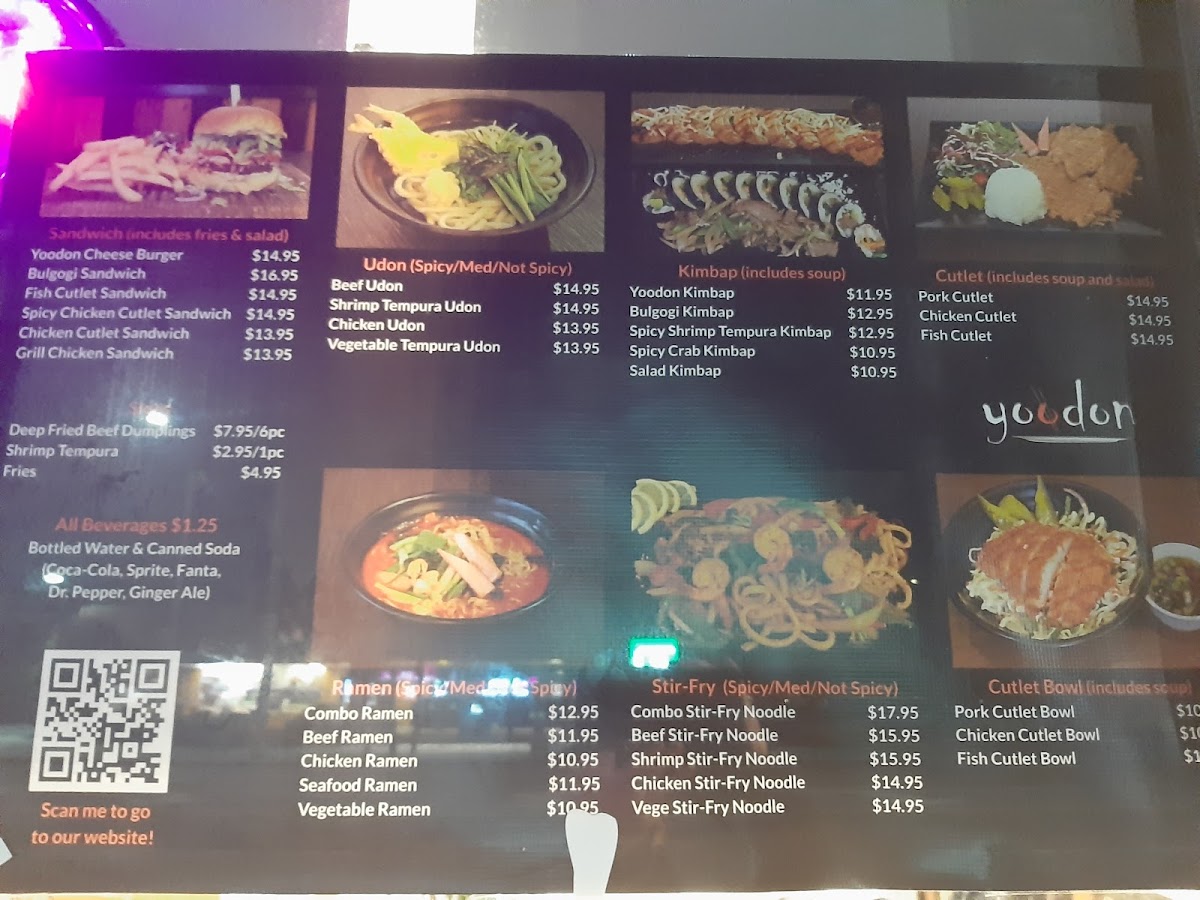The menu also features ramen, udon, and noodle dishes, alongside other Korean classics like donkatsu and bulgogi, blending flavors that invite a moment of pause and warmth. Items like the Yoodon Cheese Burger and chicken cutlet sandwich show a casual, approachable side of the menu that appeals to both familiar tastes and those open to a bit of twist on everyday bites.